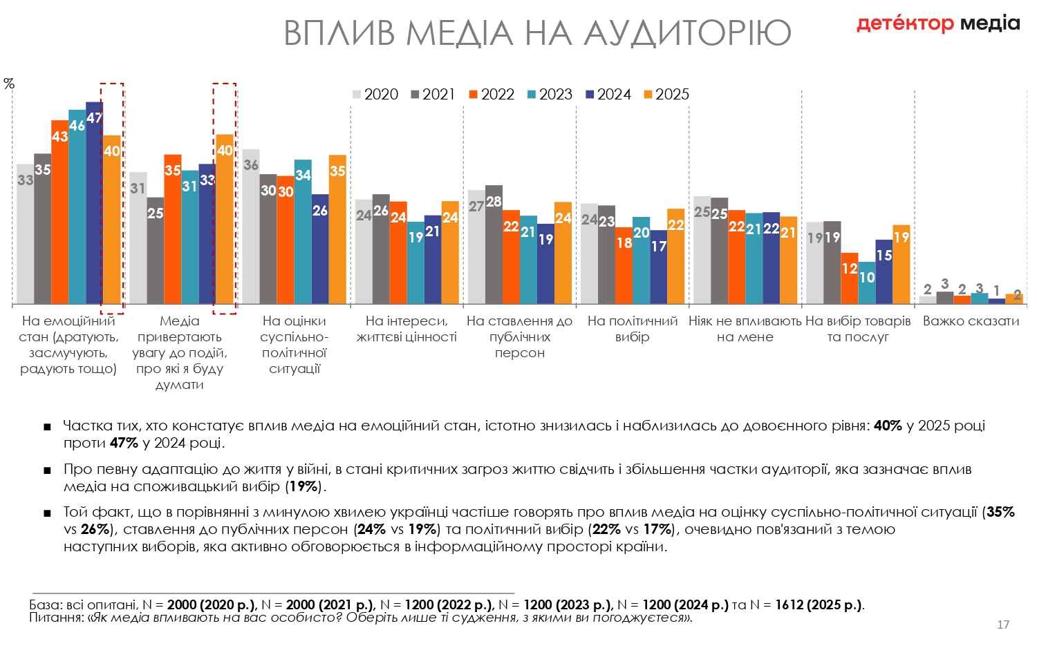 ■ Частка тих, хто констатує вплив медіа на емоційний стан, істотно знизилась і наблизилась до довоєнного рівня: 40% у 2025 році проти 47% у 2024 році. Про певну адаптацію до життя у війні, в стані критичних загроз життю свідчить і збільшення частки аудиторії, яка зазначає вплив медіа на споживацький вибір (19%). Той факт, що у порівнянні з минулою хвилею українці частіше говорять про вплив медіа на оцінку суспільно-політичної ситуації (35% vs 26%), ставлення до публічних персон (24% vs 19%) та політичний вибір (22% vs 17%), очевидно пов'язаний з темою наступних виборів, яка активно обговорюється в інформаційному просторі країни.