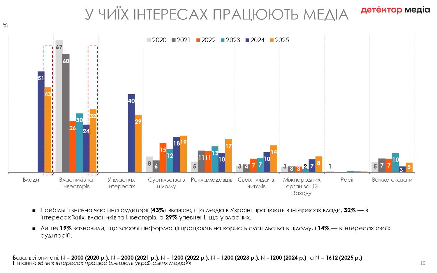 ■ Найбільш значна частина аудиторії (43%) вважає, що медіа в Україні працюють в інтересах влади, 32% — в інтересах їхніх власників та інвесторів, а 29% упевнені, що у власних. Лише 19% зазначили, що засоби інформації працюю на користь суспільства в цілому, і 14%— в інтересах своїх аудиторій.