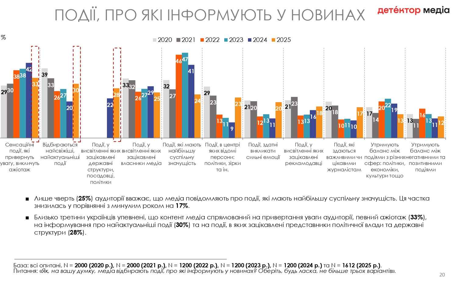 ■ Лише чверть (25%) аудиторії вважає, що медіа повідомляють про події, які мають найбільшу суспільну значущість. Ця частка знизилась у порівнянні з минулим роком на 17%. Близько третини українців упевнені, що контент медіа спрямований на привертання уваги аудиторії, певний ажіотаж (33%), на інформування про найактуальніші події (30%) та на події, в яких зацікавлені представники політичної влади та державні структури (28%).