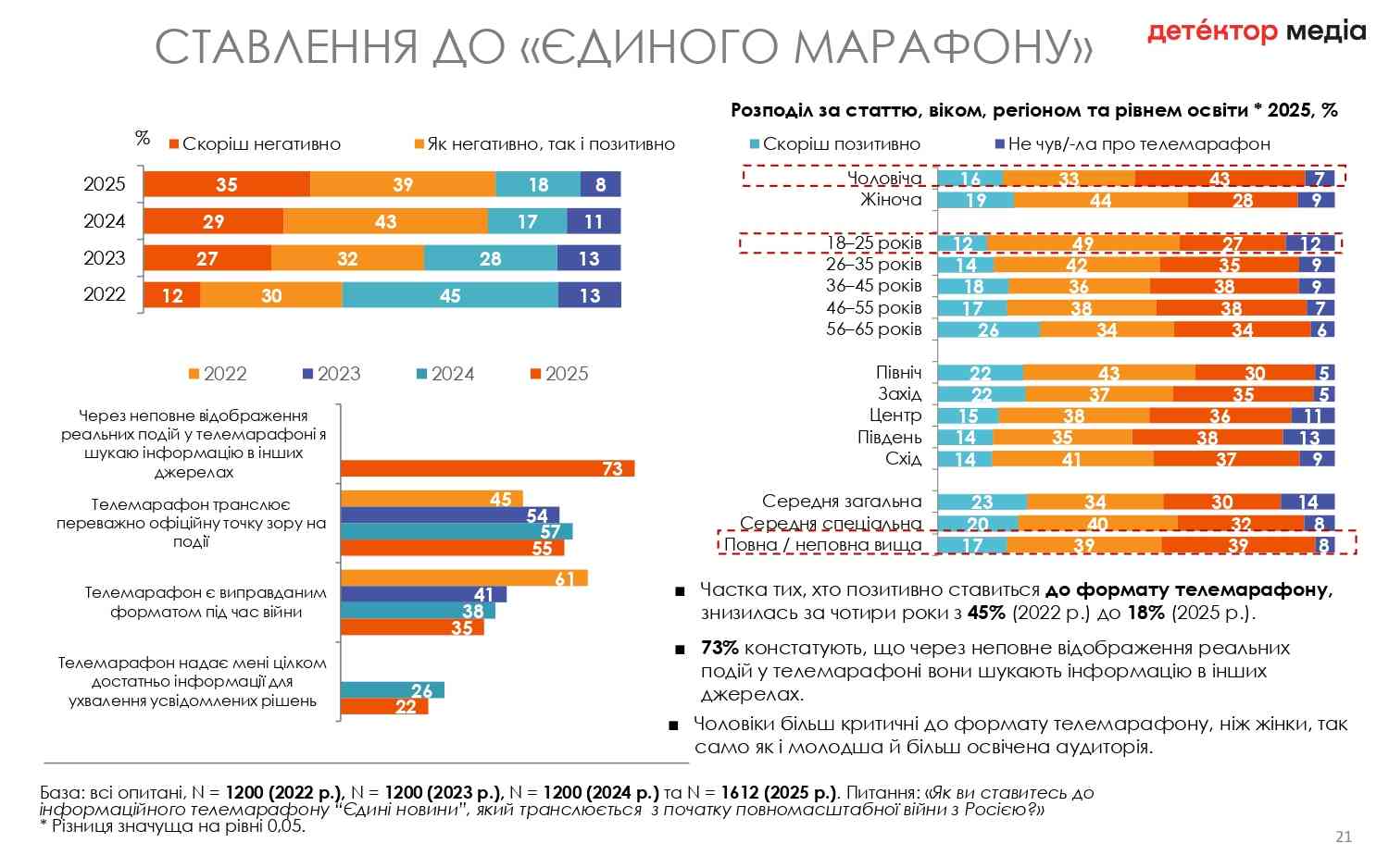 ■ У порівнянні з 2024 роком у 2025-му зросла кількість споживачів суспільно-політичного контенту в месенджерах (62% vs 71%). 30% українців звертаються до ефірів національного телемарафону «Єдині новини», і це певне зростання у порівнянні з минулим роком (26% у 2024 р.), і 18% дивляться телеканали, які не беруть участі в марафоні.