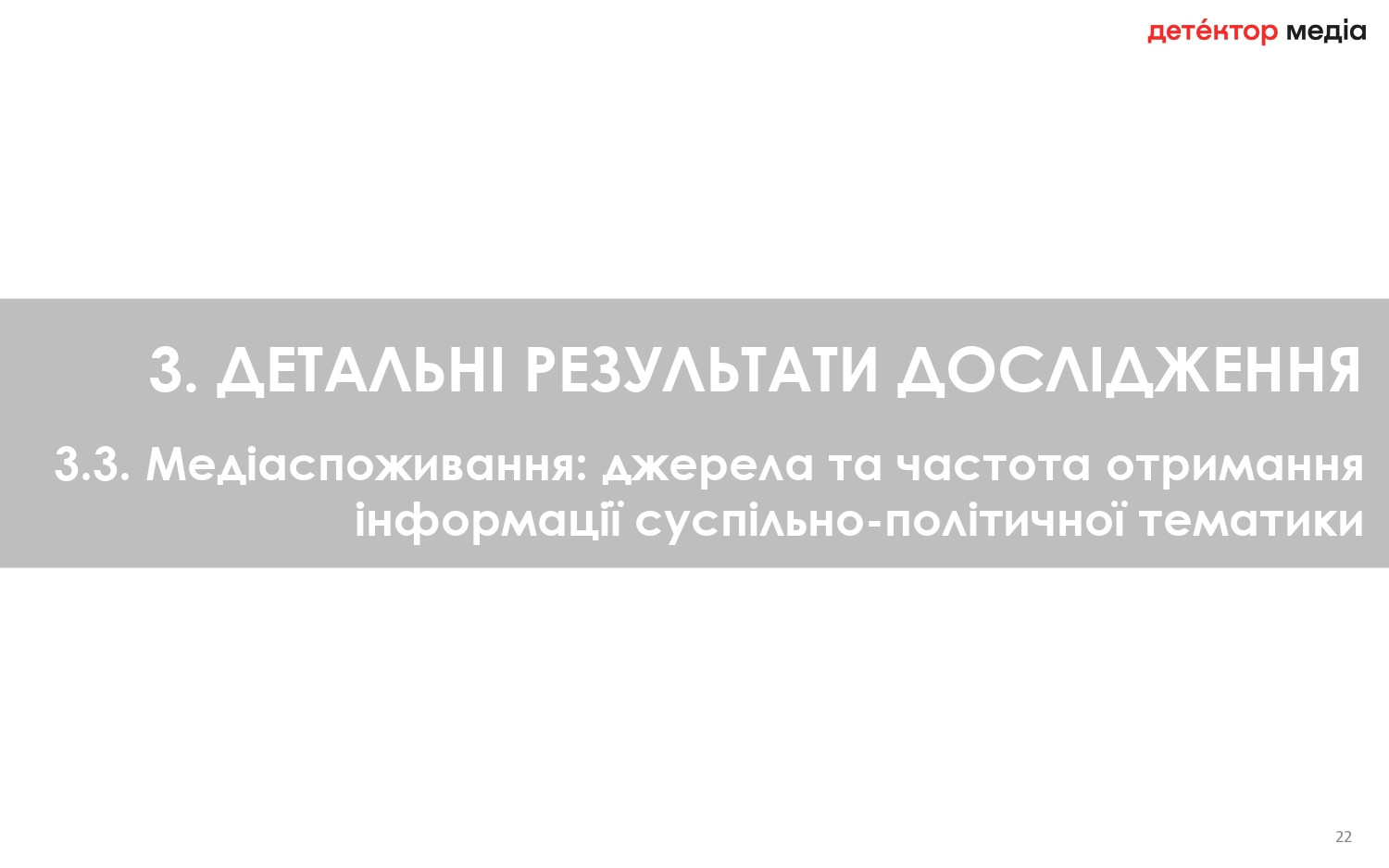 ■ Кожен п'ятий українець (22%) звертається до контенту національнийх інтернет-медіа («Українська Правда», «Цензор», «Обозреватель» тощо) на різних платформах; 19% використовують новинні сервіси (ukr.net, Unian.ua, «РБК-Україна» тощо); 14% слухають комерційні радіостанції; 11% споживають продукти Суспільного мовлення.