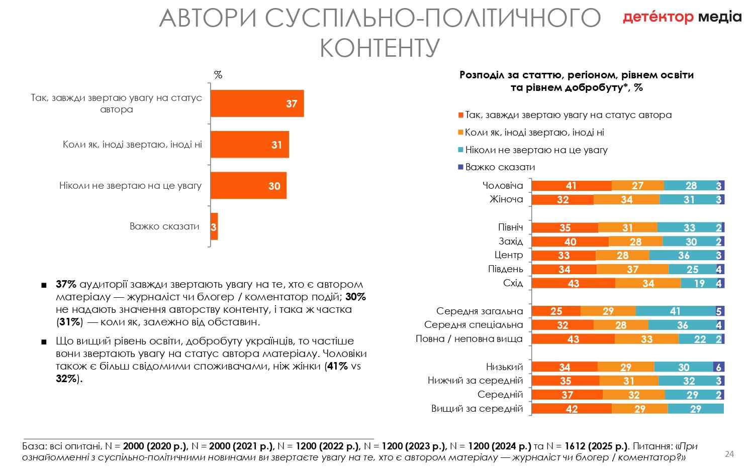 ■ 37% аудиторії завжди звертають увагу на те, хто є автором матеріалу — журналіст чи блогер / коментатор подій; 30% не надають значення авторству контенту, і така ж частка (31%) — коли як, залежно від обставин.