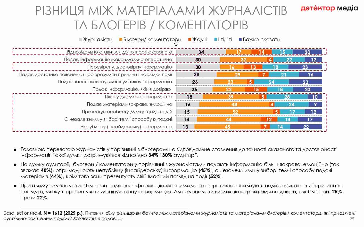 ■ Головною перевагою журналістів у порівнянні з блогерами є відповідальне ставлення до точності сказаного та достовірності інформації. Такої думки дотримуються відповідно 34% і 30% респондентів. На думку аудиторії, блогери /коментатори у порівнянні з журналістами подають інформацію більш яскраво, емоційно (так вважає 48%), оприлюднюють непублічну (інсайдерську) інформацію (45%), є незалежними у виборі тем і способу подачі матеріалів (44%). Крім того, вони презентують свій власний погляд на події (52%). При цьому і журналісти, і блогери надають інформацію максимально оперативно, аналізують подію, пояснюють її причини та наслідки, можуть презентувати маніпулятивну інформацію. Але журналісти викликають трохи більше довіри, ніж блогери: 25% проти 22%.