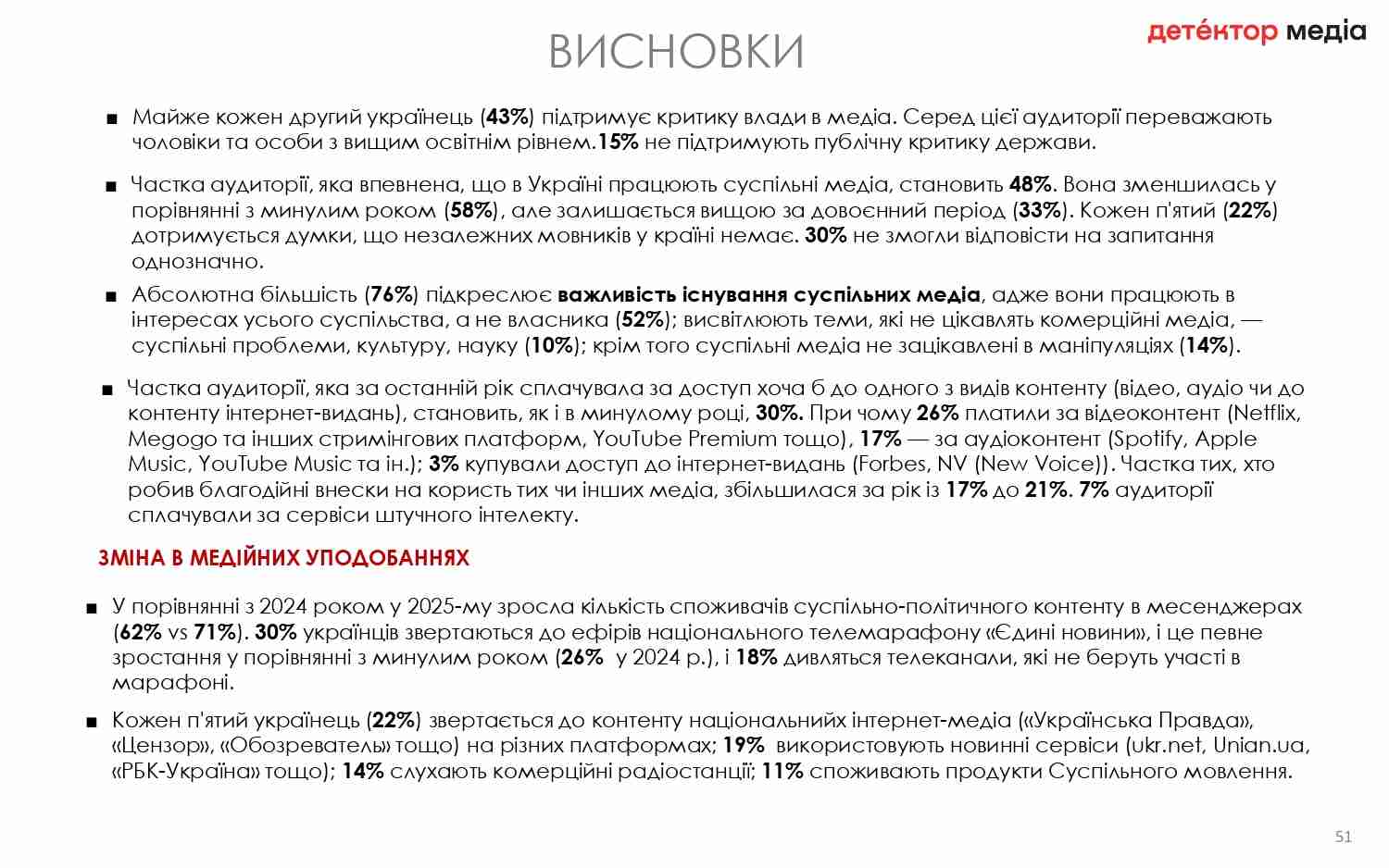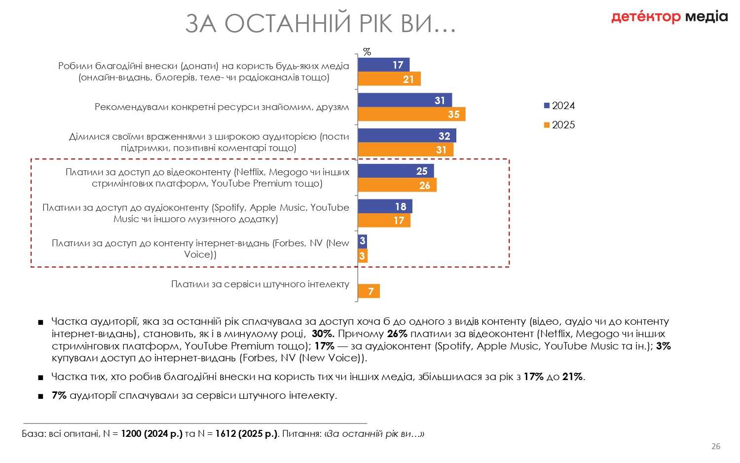 ■ Частка аудиторії, яка за останній рік сплачувала за доступ хоча б до одного з видів контенту (відео, аудіо чи до контенту інтернет-видань), становить, як і в минулому році, 30%. При чому 26% платили за відеоконтент (Netflix, Megogo та інших стримінгових платформ, YouTube Premium тощо), 17% — за аудіоконтент (Spotify, Apple Music, YouTube Music та ін.); 3% купували доступ до інтернет-видань (Forbes, NV (New Voice)). Частка тих, хто робив благодійні внески на користь тих чи інших медіа, збільшилася за рік із 17% до 21%. 7% аудиторії сплачували за сервіси штучного інтелекту.