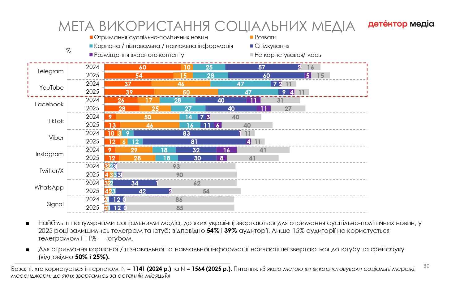■ Найбільш популярними соціальними медіа, до яких українці звертаються для отримання суспільно-політичних новин, у 2025 році залишились телеграм та ютуб: відповідно 54% і 39% аудиторії. Лише 15% аудиторії не користується телеграмом і 11% — ютубом. Для отримання корисної / пізнавальної та навчальної інформації найчастіше звертаються до ютубу та фейсбуку (відповідно 50% і 25%).