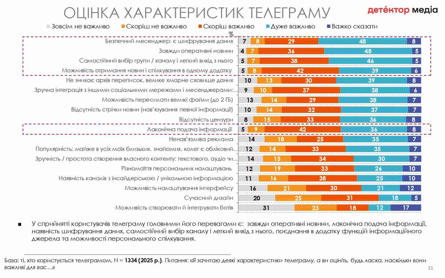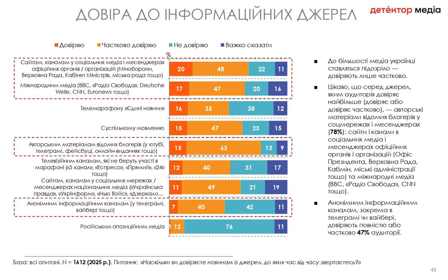 ■ До більшості медіа українці ставляться підозріло — довіряють лише частково. Цікаво, що серед джерел, яким аудиторія довіряє найбільше (довіряє або довіряє частково), — авторські матеріали відомих блогерів у соцмережах і месенджерах (78%); сайти і канали в соціальних медіа і месенджерах офіційних органів та організацій (Офіс Президента, Верховна Рада, Кабмін, міські адміністрації тощо) та міжнародні медіа (ВВС, «Радіо Свобода», CNN тощо). Анонімним інформаційним каналам, зокрема в телеграмі чи вайбері, довіряють повністю або частково 47% аудиторії