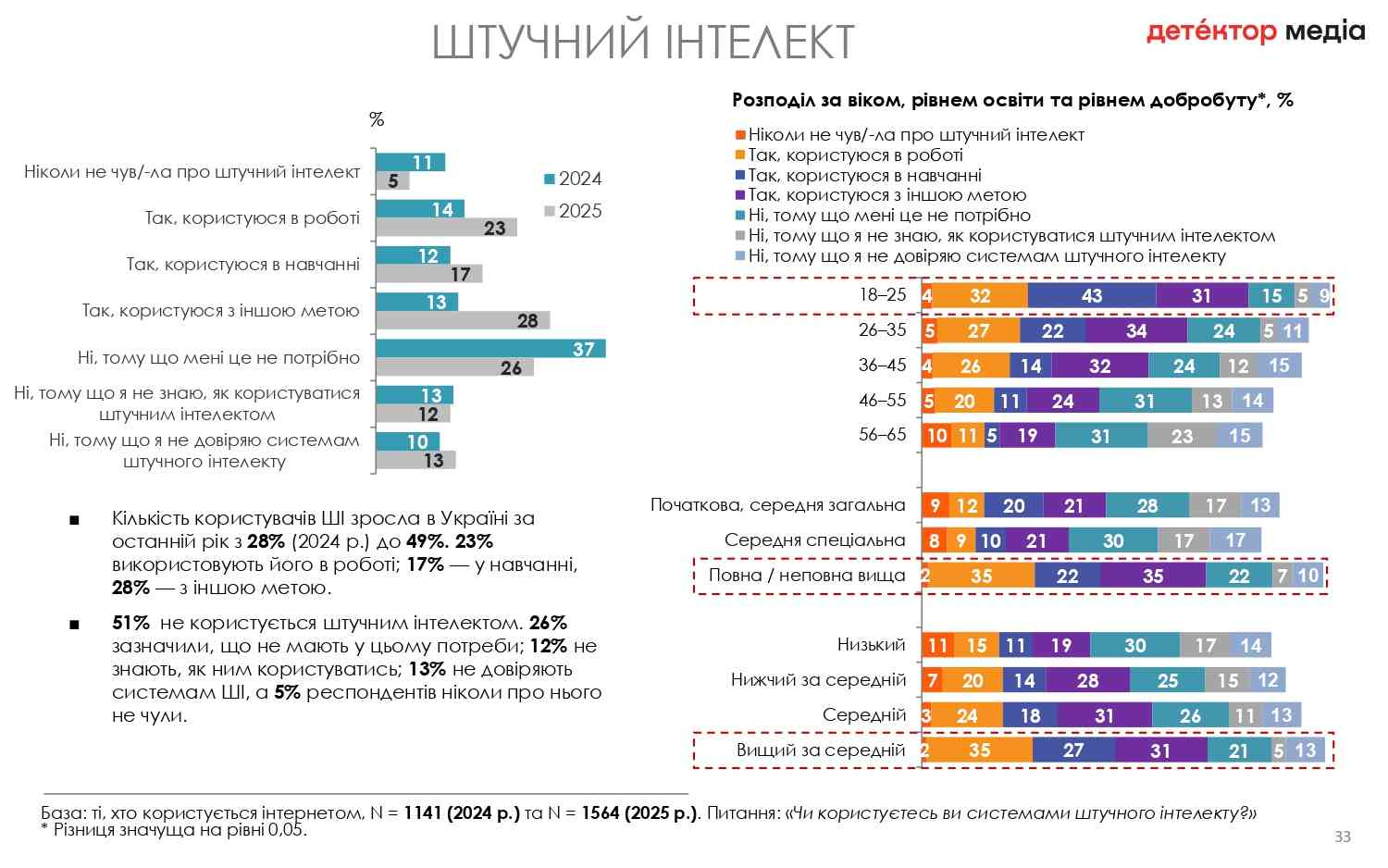 ■ Кількість користувачів ШІ зросла в Україні за останній рік з 28% (2024 р.) до 49%. 23% використовують його в роботі, 17% — у навчанні, 28% — з іншою метою. 51% не користується штучним інтелектом. 26%зазначили, що не мають у цьому потреби, 12%не знають, як ним користуватись; 13% не довіряють системам ШІ, а 5% опитаних інтернет-користувачів ніколи про нього не чули.