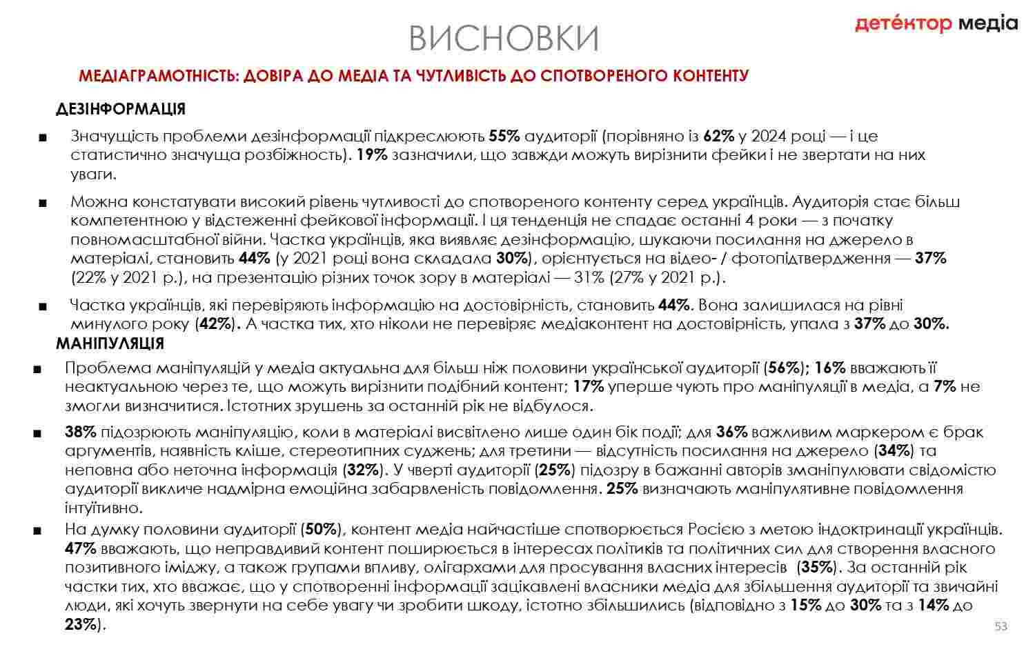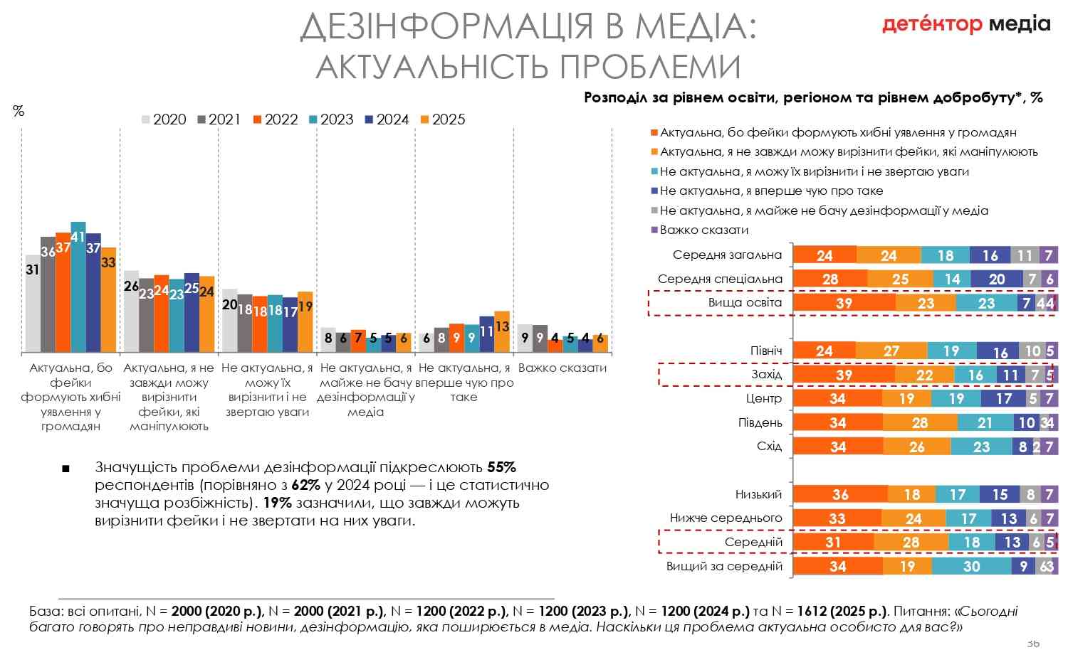 ■ Значущість проблеми дезінформації підкреслюють 55% аудиторії (порівняно із 62% у 2024 році — і це статистично значуща розбіжность). 19% зазначили, що завжди можуть вирізнити фейки і не звертати на них уваги.