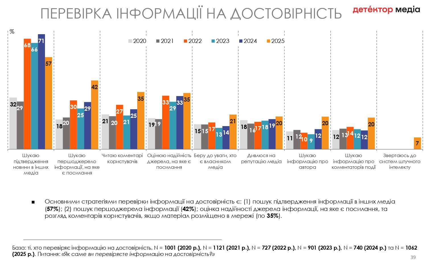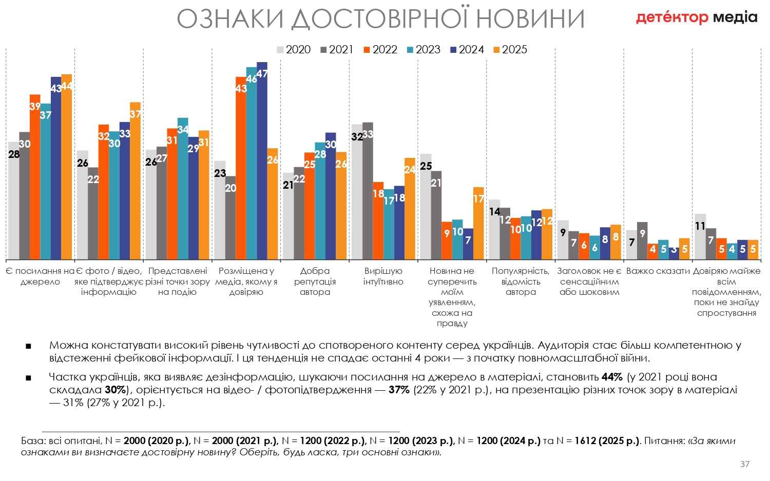 ■ Можна констатувати високий рівень чутливості до спотвореного контенту серед українців. Аудиторія стає більш компетентною у відстеженні фейкової інформації. І ця тенденція не спадає останні 4 роки — з початку повномасштабної війни. Частка українців, яка виявляє дезінформацію, шукаючи посилання на джерело в матеріалі, становить 44% (у 2021 році вона складала 30%), орієнтується на відео- / фотопідтвердження — 37% (22% у 2021 р.), на презентацію різних точок зору в матеріалі — 31% (27% у 2021 р.).