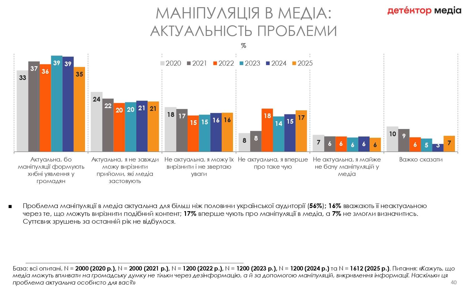 ■ Проблема маніпуляцій у медіа актуальна для більш ніж половини української аудиторії (56%); 16% вважають її неактуальною через те, що можуть вирізнити подібний контент; 17% уперше чують про маніпуляції в медіа, а 7% не змогли визначитися. Істотних зрушень за останній рік не відбулося.