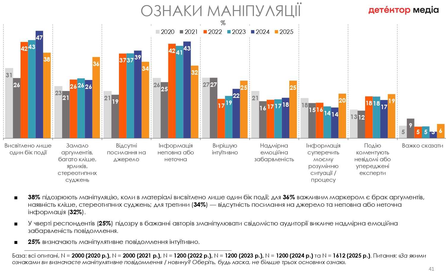 ■ 38% підозрюють маніпуляцію, коли в матеріалі висвітлено лише один бік події; для 36% важливим маркером є брак аргументів, наявність кліше, стереотипних суджень; для третини — відсутність посилання на джерело (34%) та неповна або неточна інформація (32%). У чверті аудиторії (25%) підозру в бажанні авторів зманіпулювати свідомістю аудиторії викличе надмірна емоційна забарвленість повідомлення. 25% визначають маніпулятивне повідомлення інтуїтивно.
