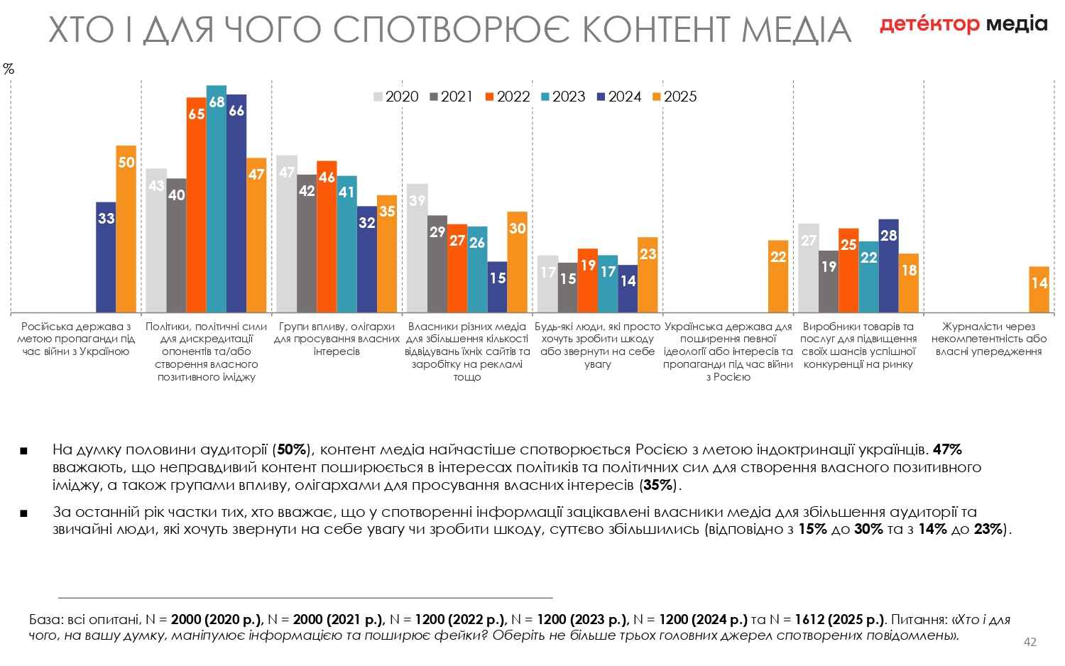 ■ На думку половини аудиторії (50%), контент медіа найчастіше спотворюється Росією з метою індоктринації українців. 47%вважають, що неправдивий контент поширюється в інтересах політиків та політичних сил для створення власного позитивного іміджу, а також групами впливу, олігархами для просування власних інтересів (35%). За останній рік частки тих, хто вважає, що у спотворенні інформації зацікавлені власники медіа для збільшення аудиторії та звичайні люди, які хочуть звернути на себе увагу чи зробити шкоду, істотно збільшились (відповідно з 15% до 30% та з 14% до 23%).