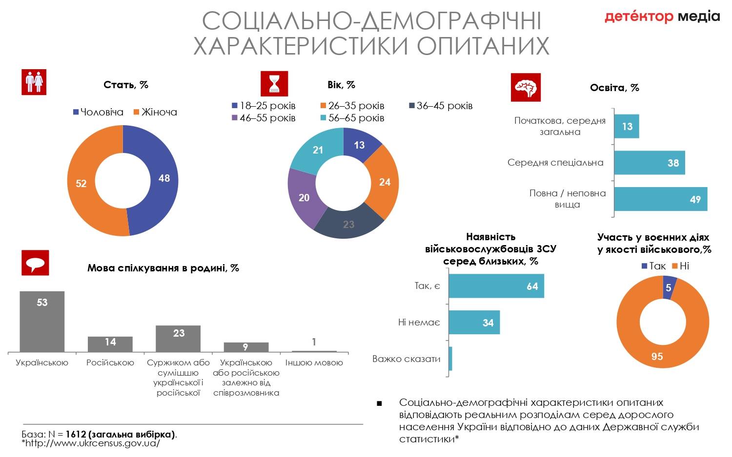 Тип вибірки: репрезентативна за віком, статтю, типорозміром населеного пункту та регіоном. Дослідження не проводилось на тимчасово окупованих територіях Донецької, Луганської, Запорізької, Херсонської областей та в АР Крим.