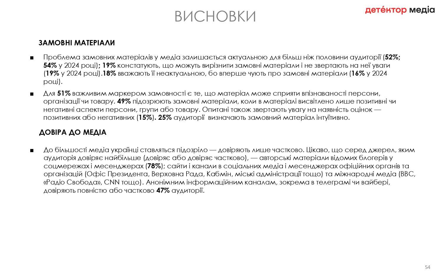 ■ Проблема замовних матеріалів у медіа залишається актуальною для більш ніж половини аудиторії (52%; 54% у 2024 році); 19% констатують, що можуть вирізнити замовні матеріали і не звертають на неї уваги (19% у 2024 році).18% вважають її неактуальною, бо вперше чують про замовні матеріали (16% у 2024 році).