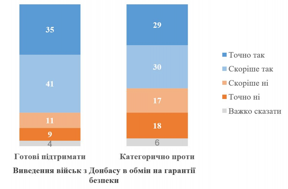 Ідею референдуму значно більше підтримують ті, хто вже готовий схвалити виведення українських військ з Донбасу в обмін на гарантії безпеки від США та Європи. Серед них 71% позитивно ставляться до ідеї референдуму, 25% — виступають проти, ще 5% — не визначилися.