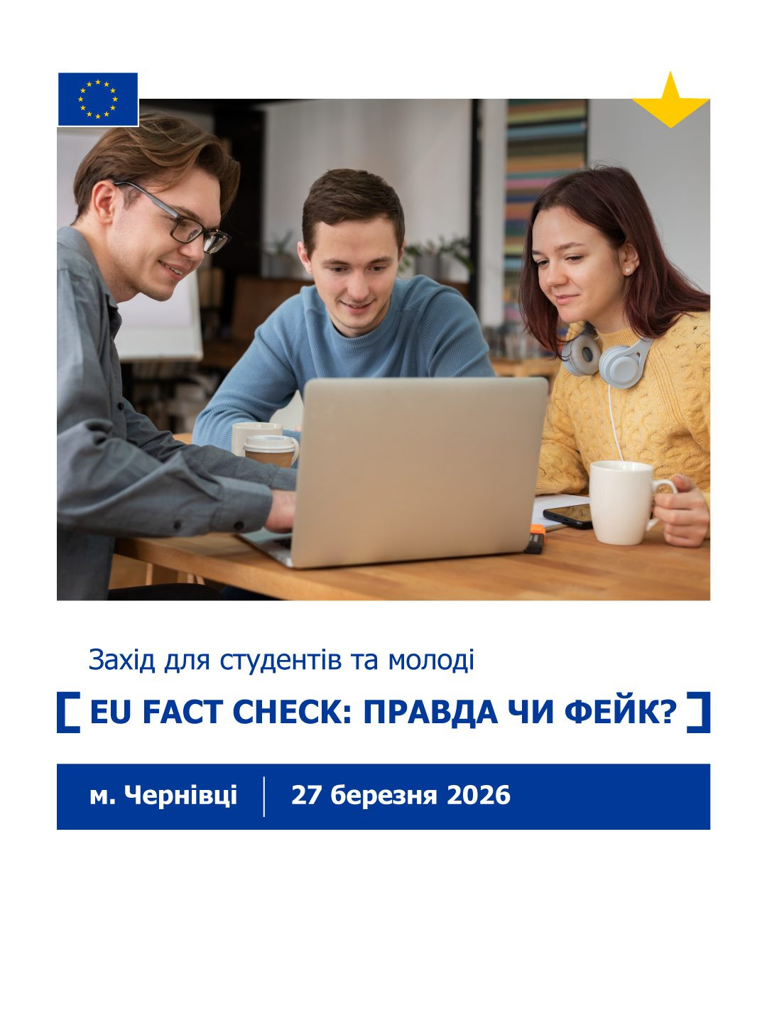 Запрошуємо студентів та активну молодь із Чернівецької області на інтерактивний офлайн-захід «EU Fact Check: правда чи фейк?» від команди «Проєкту з підвищення обізнаності та посилення стійкості до дезінформації про ЄС в Україні».