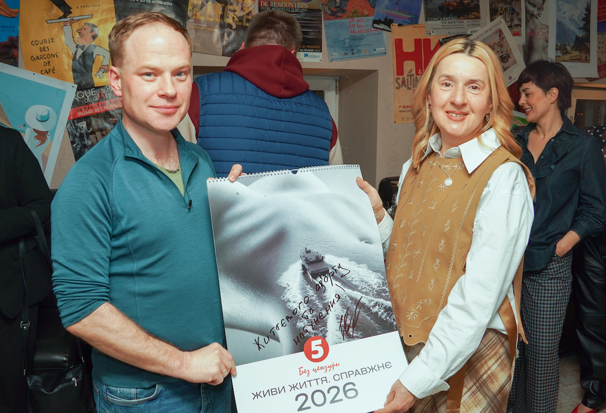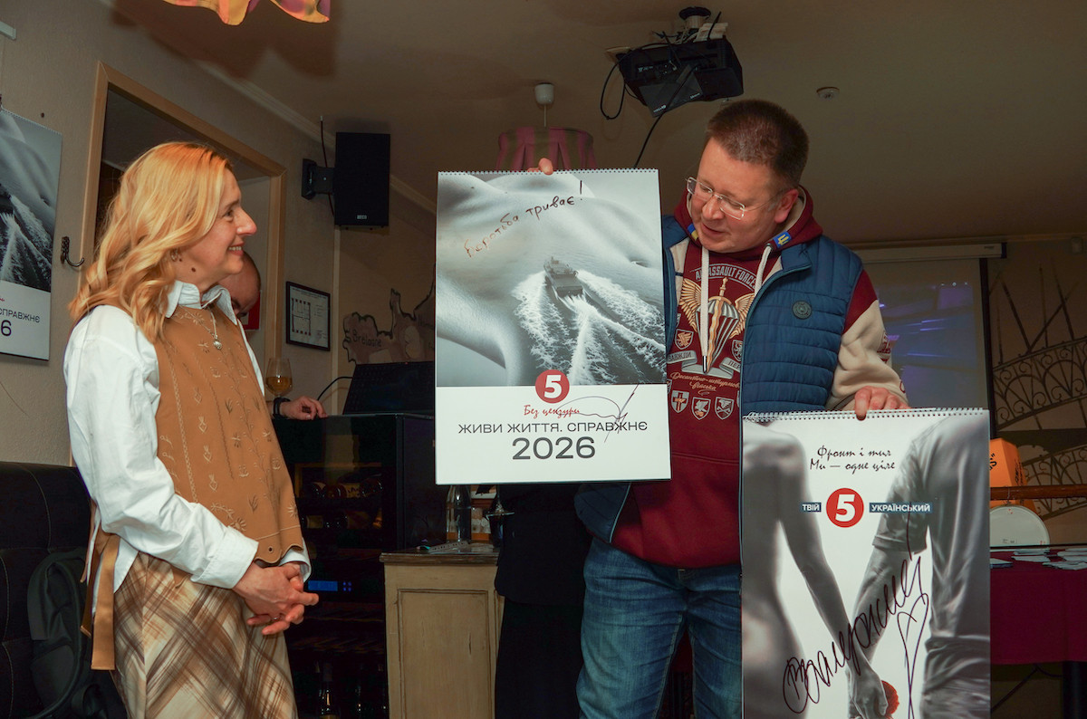 На головному фото: Власниця Très Français Наталія Невядомська та гендиректор 5-го каналу Володимир Мжельський із календарями, підписаними Сирським та Залужним