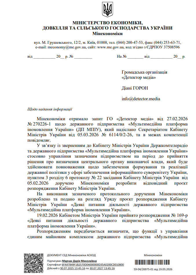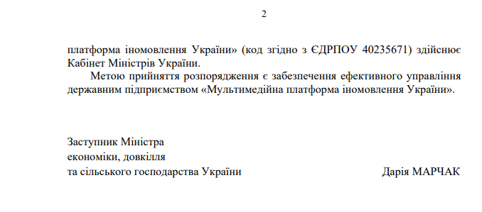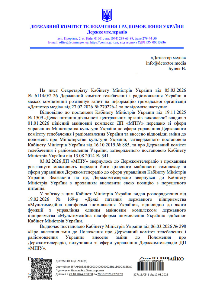 «Зважаючи на це, Держкомтелерадіо звернувся до Кабінету Міністрів України з проханням висловити свою позицію з порушеного питання. У зв’язку з цим Кабінет Міністрів України видав розпорядження від 19.02.2026 No 169-р "Деякі питання державного підприємства "Мультимедійна платформа іномовлення України", відповідно до якого функції з управління єдиним майновим комплексом державного підприємства "Мультимедійна платформа іномовлення України" здійснює Кабінет Міністрів України», — йдеться у відповіді Держкомтелерадіо.