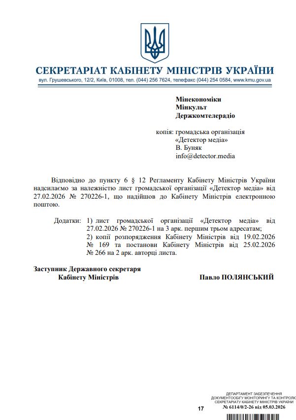 Утім, 5 березня Кабмін повідомив, що переслав наш лист «за належністю» до Мінекономіки, Мінкульту та Держкомтелерадіо.
