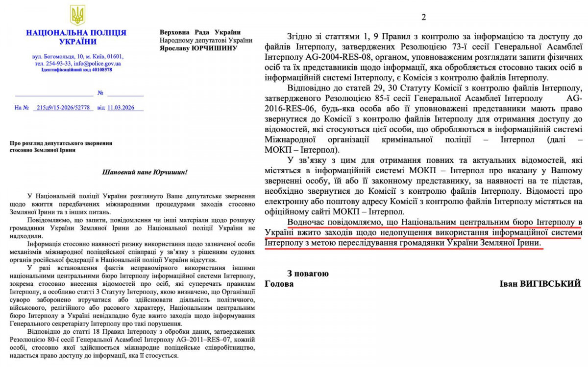 «Водночас повідомляємо, що Національним центральним бюро Інтерполу в Україні вжито заходів щодо недопущення використання інформаційної системи Інтерполу з метою переслідування громадянки України Земляної Ірини», — додали у Нацполіції.