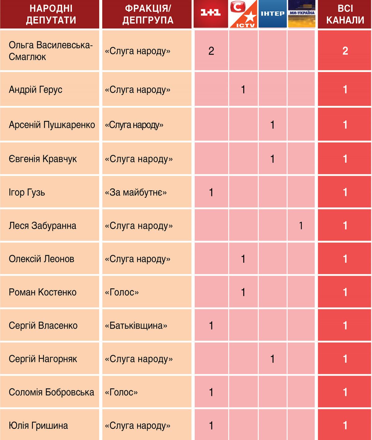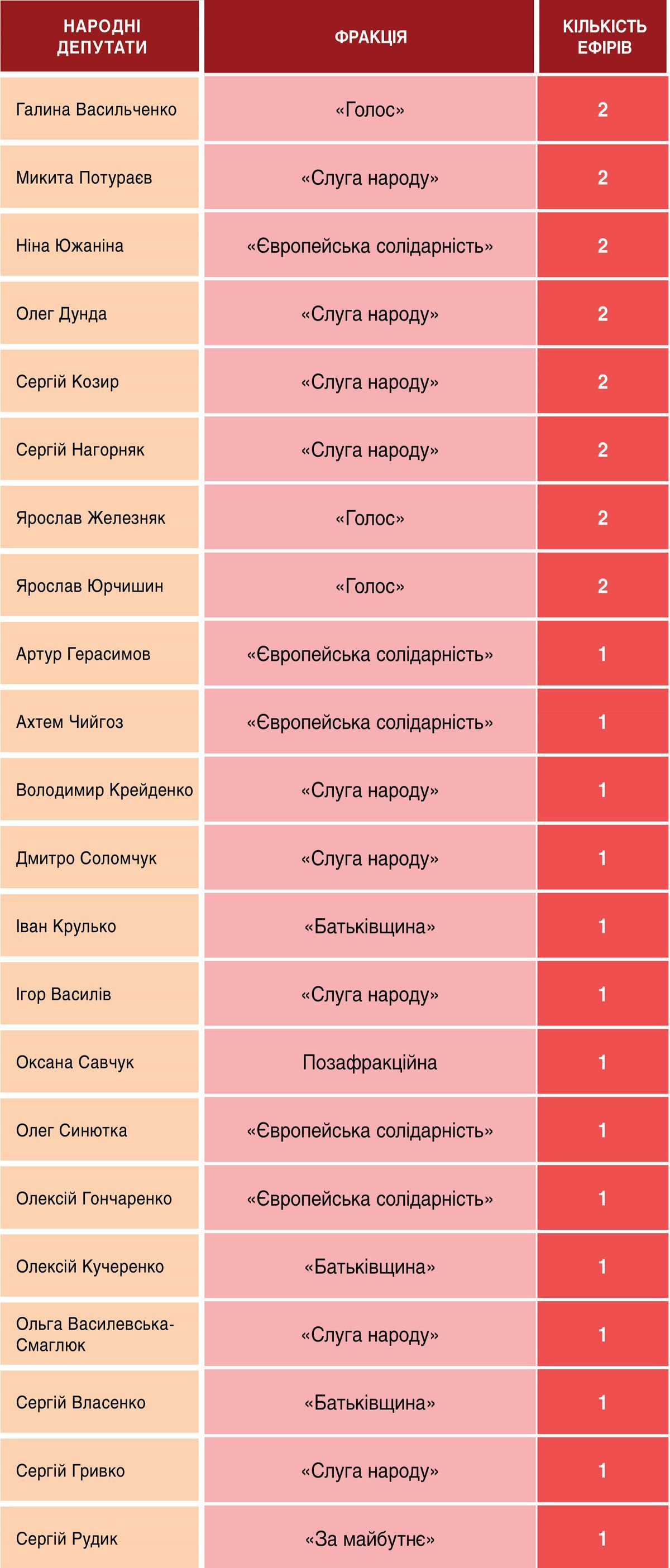 За персоналіями список гостей-депутатів в ефірах Суспільного виглядав так: