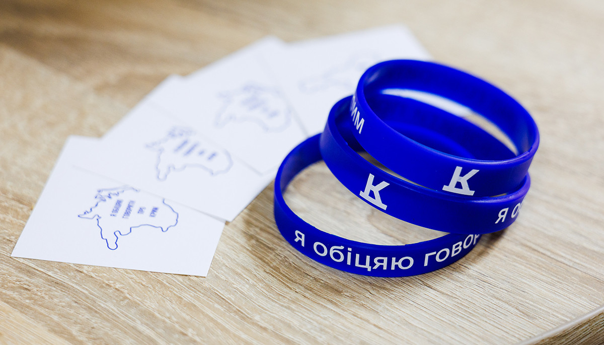 Наліпки та браслети «Я обіцяю говорити про Крим», які глядачі отримали на згадку про подію