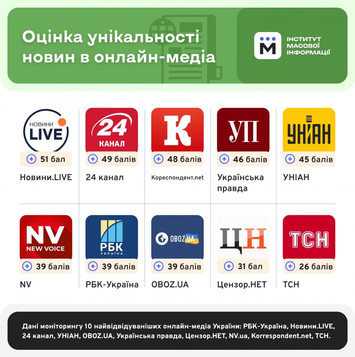 Новини.LIVE – 51 бал. У вибірці – шість ексклюзивів, 41 доопрацьований матеріал та три SEO-публікації. Вирішальним фактором того, що медіа отримало найбільшу кількість балів, стали ексклюзивні матеріали, зокрема з посиланням на власного кореспондента.