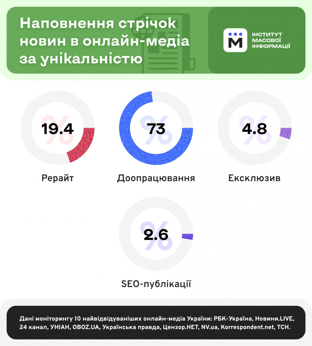 Виявилося, що новинні стрічки провідних українських онлайн-медіа переважно складаються з переписаних одне в одного матеріалів з додаванням свого бекграунду. Як показав моніторинг ІМІ, частка таких публікацій у середньому становить 73%. На додачу 19,4% становить чистий рерайт, навіть без додавання бекграунду. Ще 2,6% – SEO-матеріали, що покликані збирати випадкові кліки й лише засмічують стрічки новин: побутові поради, рецепти страв та гороскопи. Отже, лише 4,8% залишається для оригінальних новин, що ґрунтуються на ексклюзивах – повідомленнях власних кореспондентів, коментарях, даних, отриманих редакцією. Тобто абсолютна більшість новин – це лише механічно переписані та прикрашені бекграундами матеріали, що відсилають до переписаних раніше. Загалом вони просто агрегують повідомлення, що вже були оприлюднені на інших платформах.