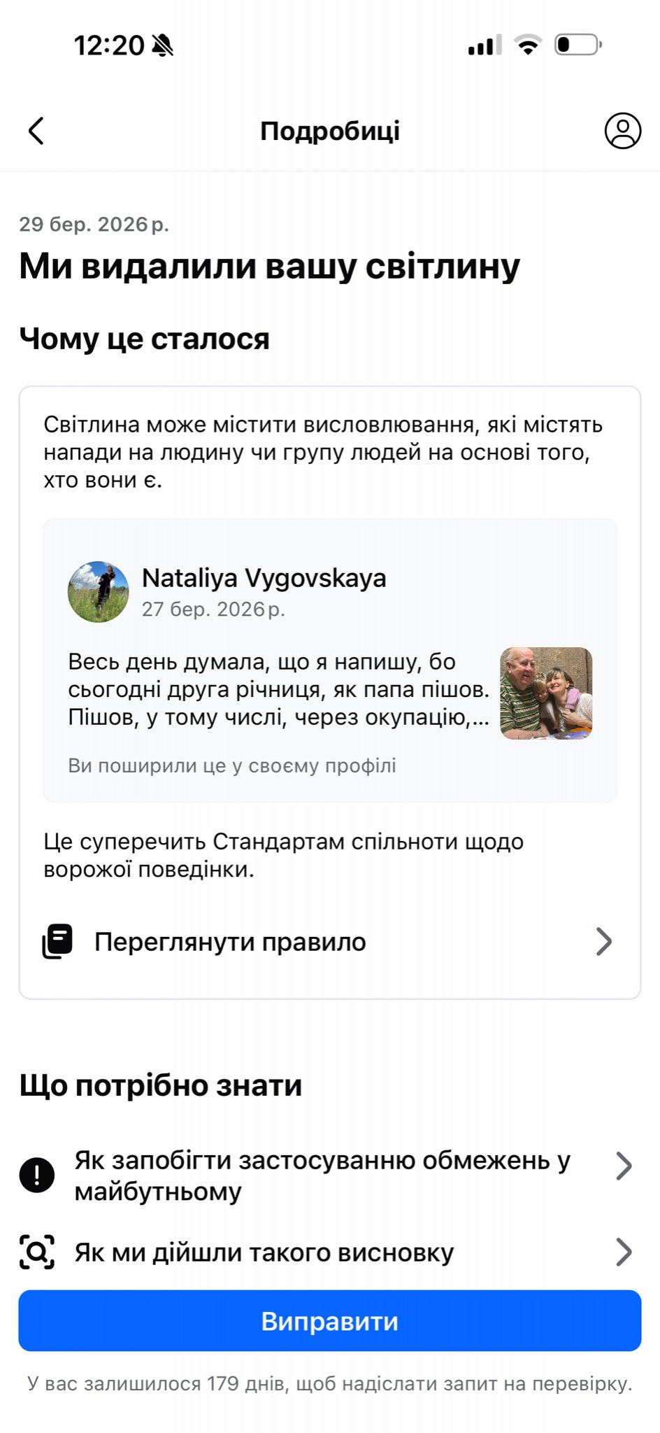 «Я подала апеляцію, але отримала відповідь, що допис зі світлиною, на якій ми з батьком і моєю донькою останній раз разом сфотографовані перед його смертю, може містити висловлювання, які містять напади на групу людей на основі того, хто вони є”. А Meta не дозволяє висловлювання, що містять напади на людину чи групу людей на основі їхньої ідентичності», — поділилася Наталія Виговська в розмові з ІМІ.