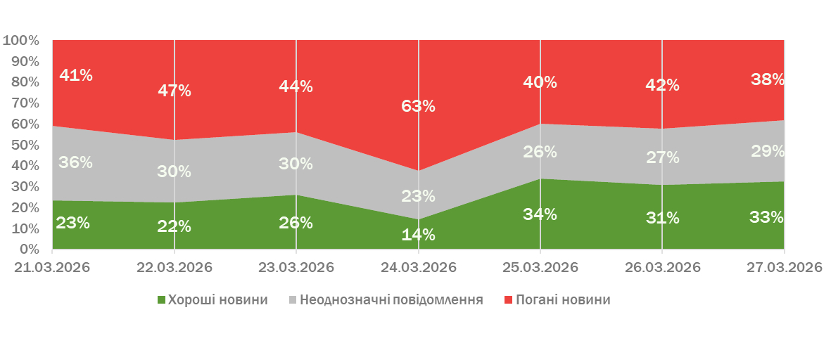Обстріли України: гнів, сум, дещиця критики ППО в західних областях і критика тих, хто критикує. У фокусі уваги центральних і регіональних ресурсів – дві хвилі обстрілів України «шахедами» 24 березня, вночі та вдень. Помітні новини про вибухи і загиблих/постраждалих упродовж дня – в Полтаві, Запоріжжі, Вінниці, на Харківщині (удар FPV-дроном по потягу). Окремий акцент посеред доби – на західних областях: у Львові – ураження багатоповерхівки в спальному районі та пам’ятки культури в історичному центрі; в Івано-Франківську – удар по пологовому будинку і загибель нацгвардійця з донькою (щодо цього – окрема значна хвиля суму ввечері, з подачі мера Р. Марцінківа).