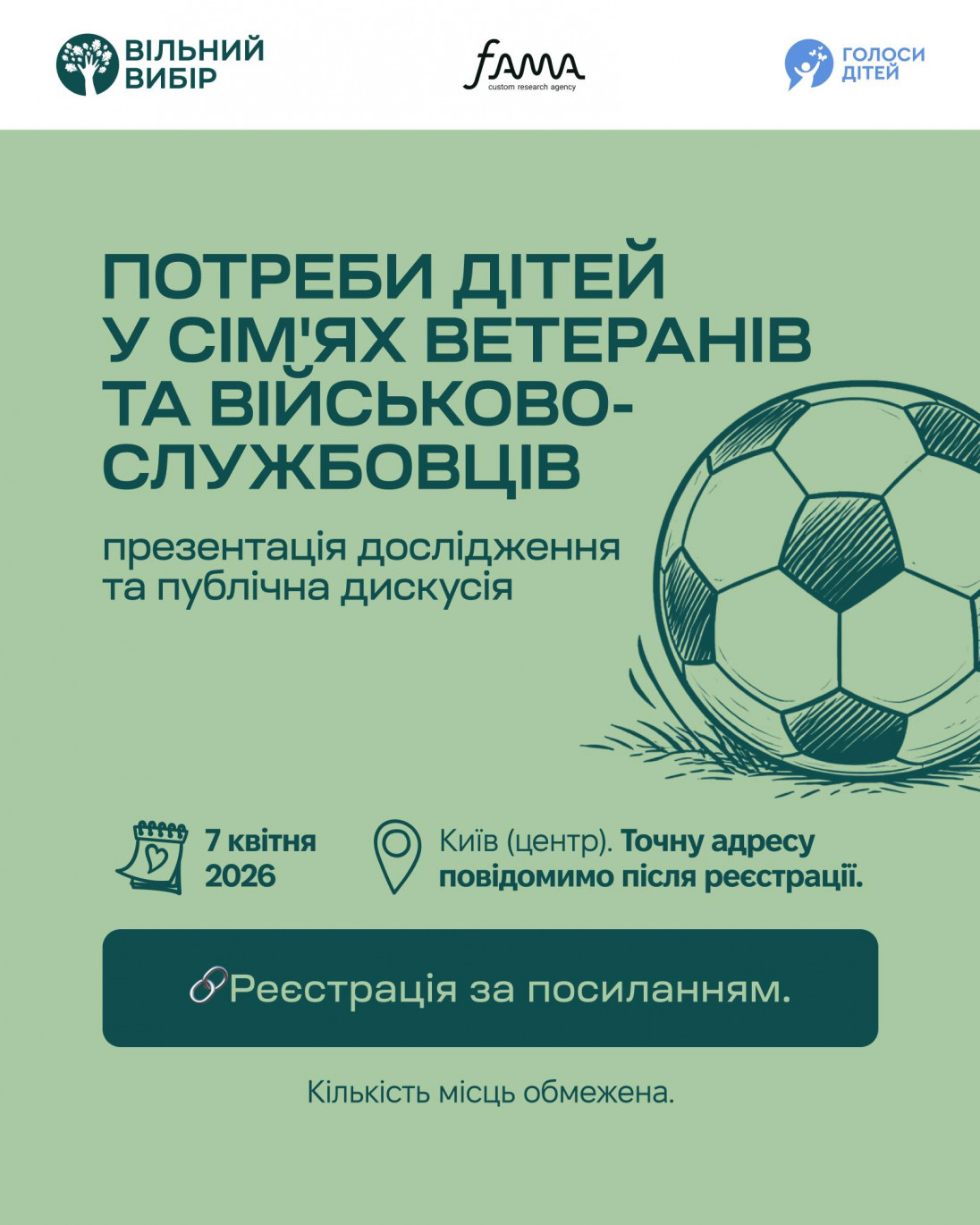 Громадська організація "Вільний Вибір" запрошує журналістів на унікальну подію - презентацію дослідження "Потреби дітей у сім’ях ветеранів та військовослужбовців". Дослідження розкриває невидимий досвід підлітків 10-16 років, чиє дитинство минає під час війни, і пропонує практичні рішення для шкіл, громад та родин.