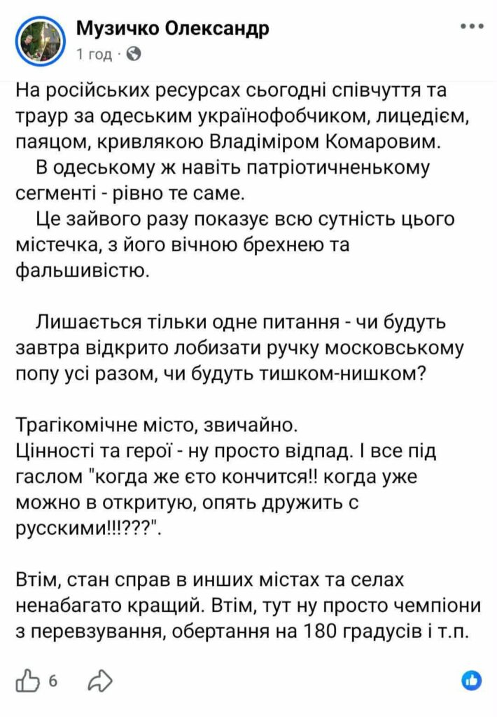 Напередодні Олександр Музичко опублікував допис у соцмережах з різкими висловлюваннями щодо покійного актора та коміка Володимира Комарова.