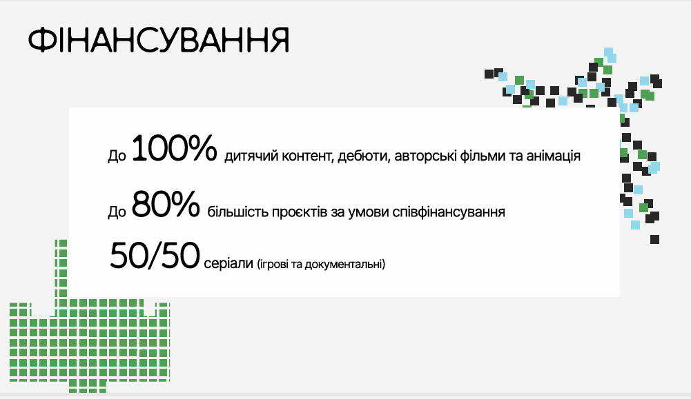 Повне фінансування (до 100%) — передбачене для авторської та анімаційної продукції, а також дебютів та контенту для дітей.