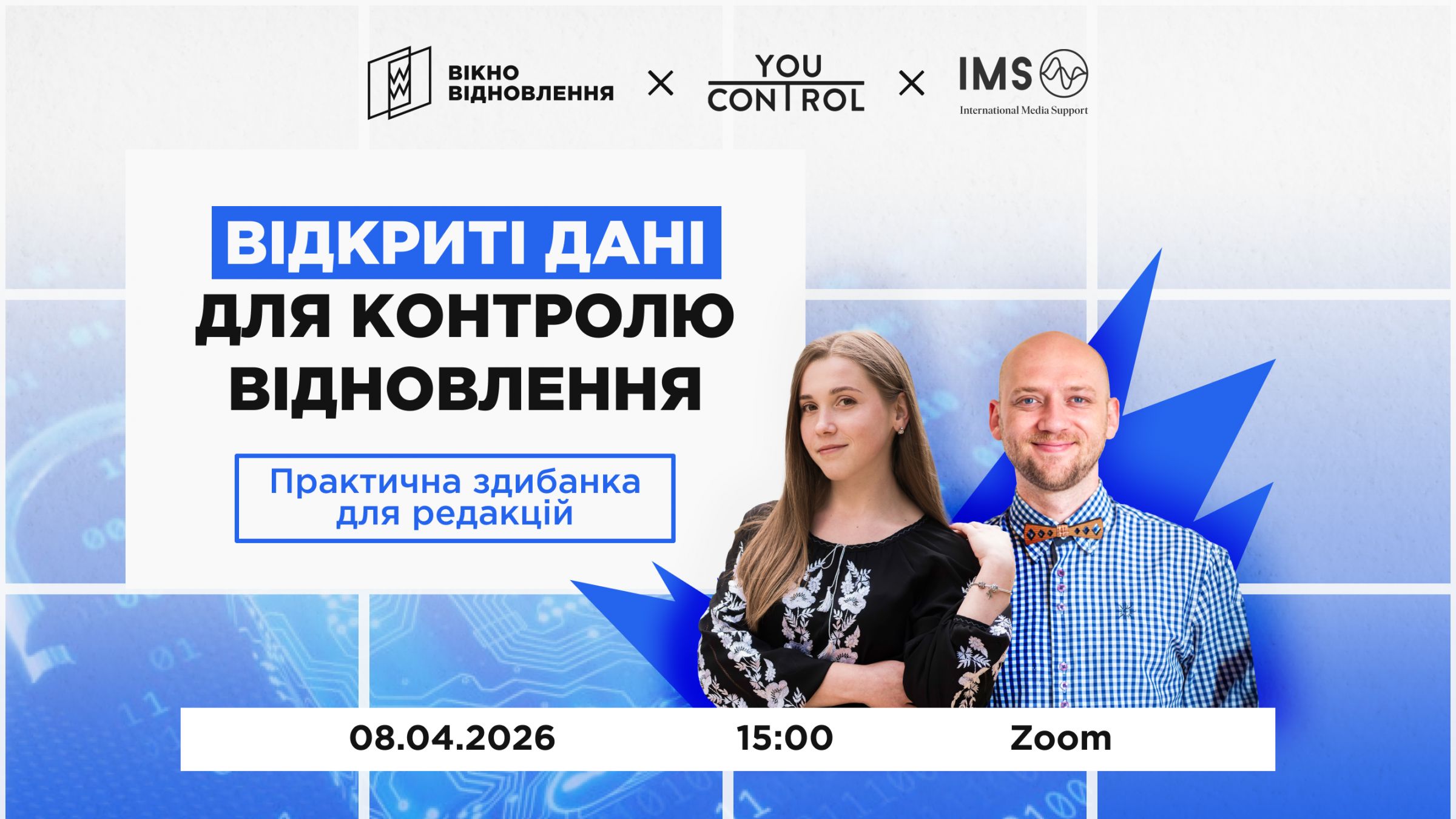Як журналістам розслідувати проєкти відновлення за допомогою відкритих даних? 8 квітня о 15:00 «Вікно Відновлення» спільно з YouControl проведе за підтримки IMS практичну онлайн-здибанку про цифрові інструменти для контролю відбудови. Учасники отримають готовий алгоритм моніторингу для своєї редакції. Участь безоплатна за умови реєстрації.