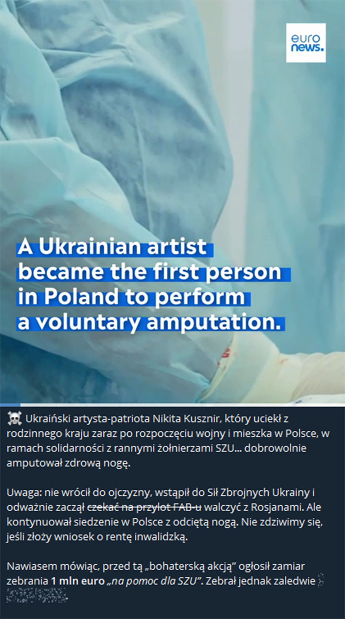 Серед прикладів — поширення конспірологічного фейку про Бріджит Макрон, вигадки про «українські дрони» над Польщею, історії про нібито самокаліцтво українців і перекручування фактів кримінальних інцидентів. У кожному випадку реальні події або повністю вигадані, або радикально спотворені.