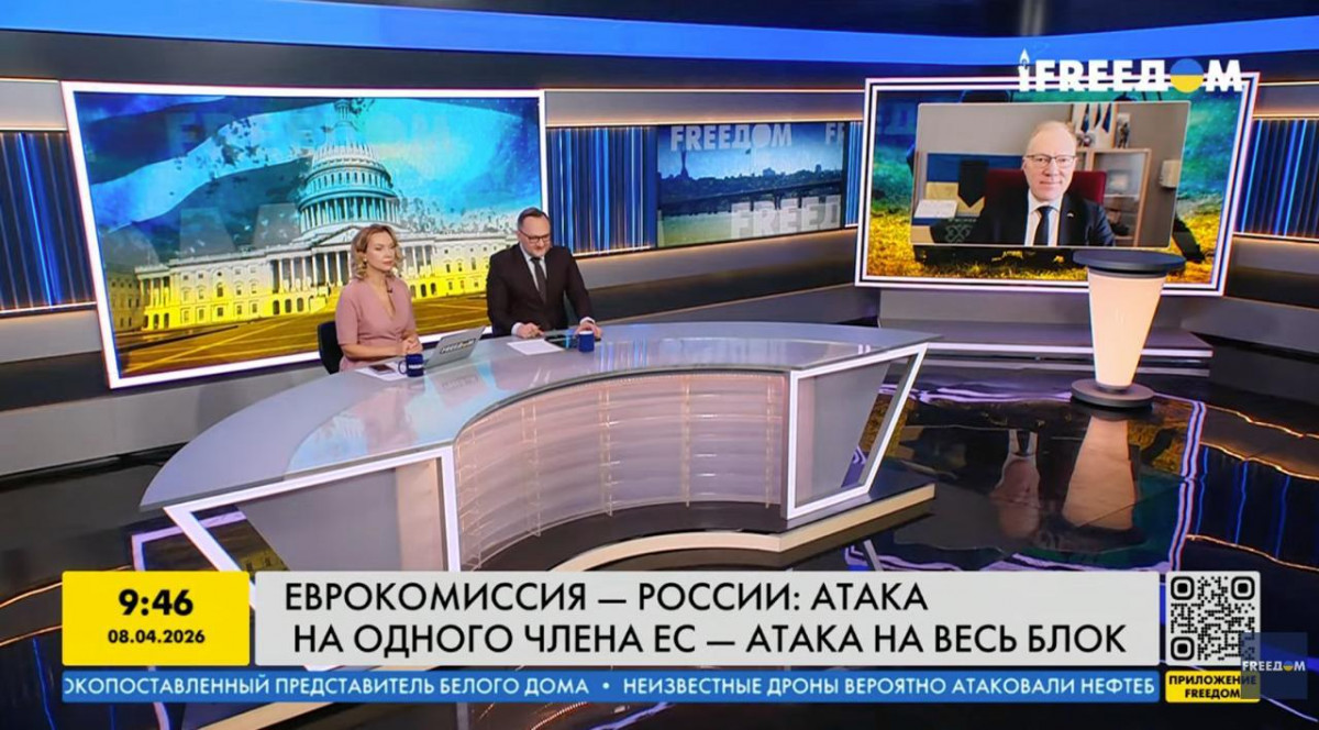 «Насправді 8 квітня о 9:46 в ефірі "FreeДом" був матеріал про позицію Єврокомісії щодо погроз Росії країнам Балтії. Ситуацію через відеозв’язок на екрані у студії коментував голова Комітету закордонних справ парламенту Естонії Марко Міхельсон, саме це відео було на екрані», — повідомило ДП «МПІУ».