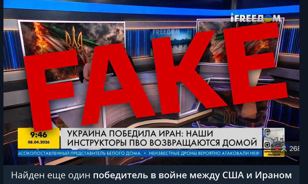На зображенні кадру з ефіру «FreeДом» розмістили фейковий текст титру: «Украина победила Иран. Наши инструкторы ПВО возвращаются домой» (укр. «Україна перемогла Іран. Наші інструктори ППО повертаються додому»).