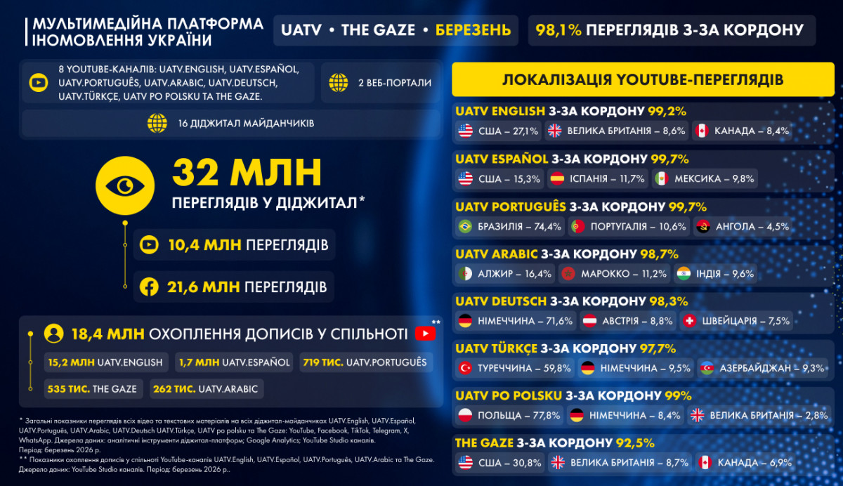 * Загальні показники переглядів всіх відео та текстових матеріалів на всіх діджитал-майданчиках UATV.English, UATV.Español, UATV.Português, UATV.Arabic, UATV.Deutsch, UATV.Türkçe, UATV po polsku та The Gaze: YouTube, Facebook, TikTok, Telegram, Х, WhatsApp. Джерела даних: аналітичні інструменти діджитал-платформ; Google Analytics; YouTube Studio каналів. Період: березень 2026 р.
