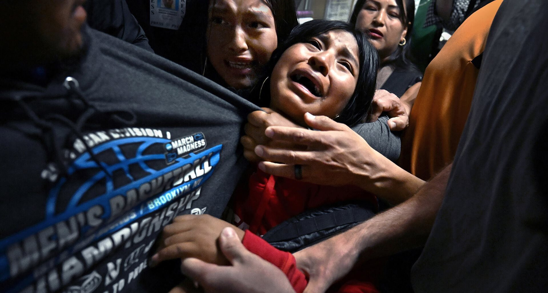 На фото показано, як засмучені доньки мігранта з Еквадору чіпляються за свого батька в момент затримання його агентами Імміграційної та митної служби США (ICE) після слухання в Нью-Йорку.