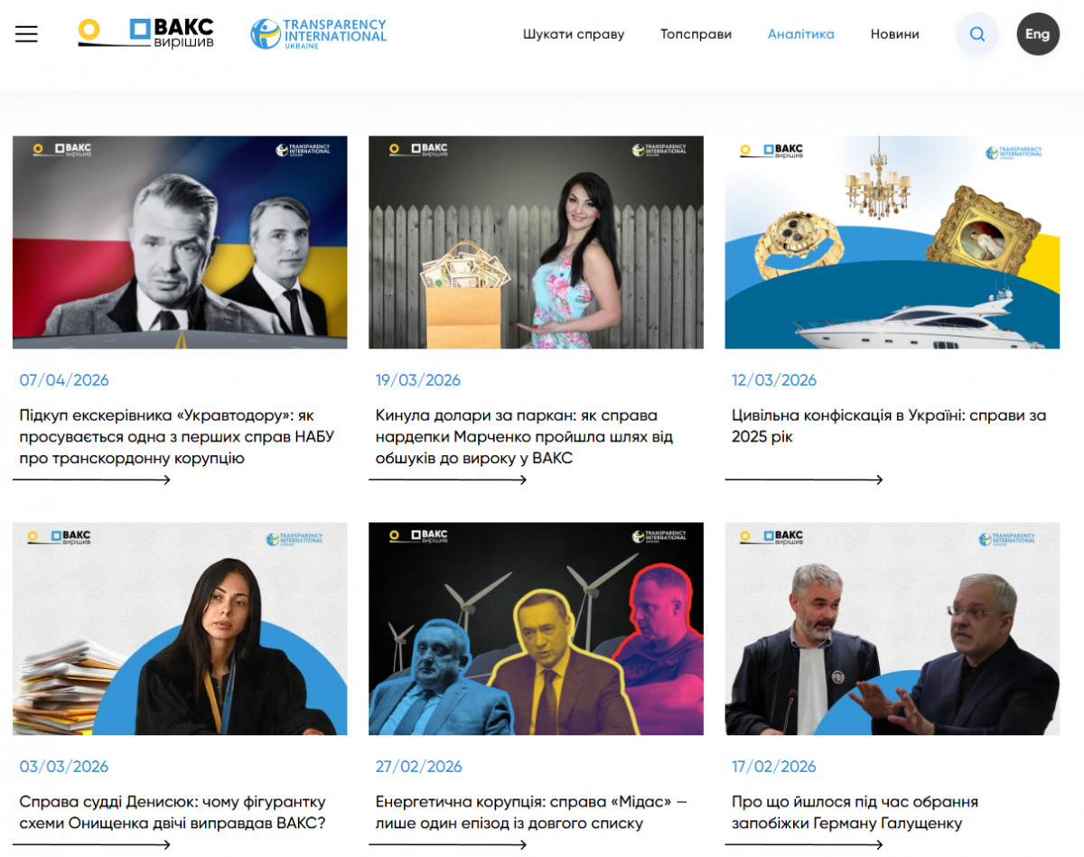 Саме тому команда Transparency International Ukraine, яка від початку роботи Вищого антикорупційного суду моніторить його роботу, у 2024 році створила платформу «ВАКС вирішив» — це найповніший масив верифікованих та опрацьованих даних про корупційні справи. Фактично це онлайн‑база, яка об’єднує рішення ВАКС, описи, трансляції й аналітику корупційних справ, або повноцінний цифровий навігатор для медійників, які працюють з антикорупційною тематикою.