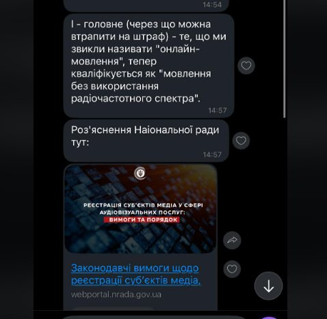 По-друге, про правову невизначеність. Три роки Нацрада реєструвала ютуб-канали, інстаграми, тіктоки як онлайн медіа. В січні цього року вона різко змінила свою інтерпретацію законодавства, і зробила це без публічного пояснення, без консультацій з ринком, без перехідного періоду. Сьогодні ж розіслала деяким регіонам вимоги реєструвати кожну дистрибуційну платформу в соцмережах як окреме аудіовізуальне медіа, під загрозою штрафів.