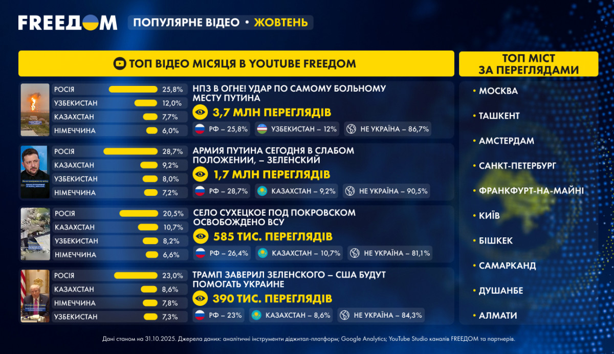 **** Сума переглядів усього відео даної тематики на всіх діджитал-майданчиках ДП “МПІУ”: YouTube, Facebook, TikTok, Telegram, Х, WhatsApp. Джерела даних: аналітичні інструменти діджитал-платформ; Google Analytics; YouTube Studio каналів FREEДОМ. Період: жовтень 2025 р.