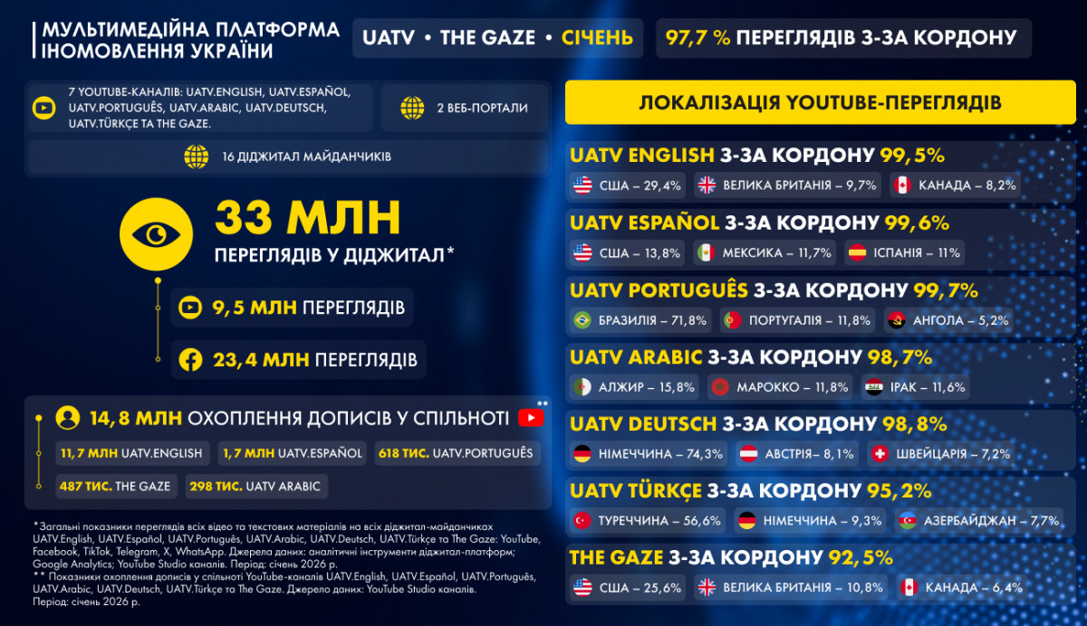 * Загальні показники переглядів всіх відео та текстових матеріалів на всіх діджитал-майданчиках UATV.English, UATV.Español, UATV.Português, UATV.Arabic, UATV.Deutsch, UATV.Türkçe та The Gaze: YouTube, Facebook, TikTok, Telegram, Х, WhatsApp. Джерела даних: аналітичні інструменти діджитал-платформ; Google Analytics; YouTube Studio каналів. Період: січень 2026 р.