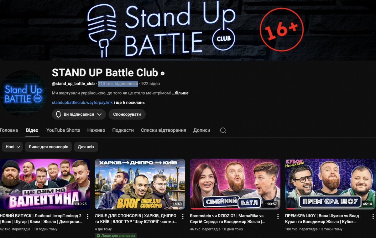 Переходимо до іншого клубу, продукт якого я, на відміну від класичного «не читав, але засуджую» все ж дивлюсь, але більше як шок-контент. Типу піти і знову переконатися, що людям таке смішно. А воно не просто «комусь» смішне. Воно з моменту потрапляння в ютуб набирає удвічі більше переглядів, ніж шоу «Підпільного». Так, ми зараз говоримо про «Бродячий стендап» — 148 тисяч підписників на основному каналі. Ще 25 тисяч на «Бродячому LIVE». Тобто підписників у них менше, ніж у «Підпільного», але дивляться їх значно жвавіше.