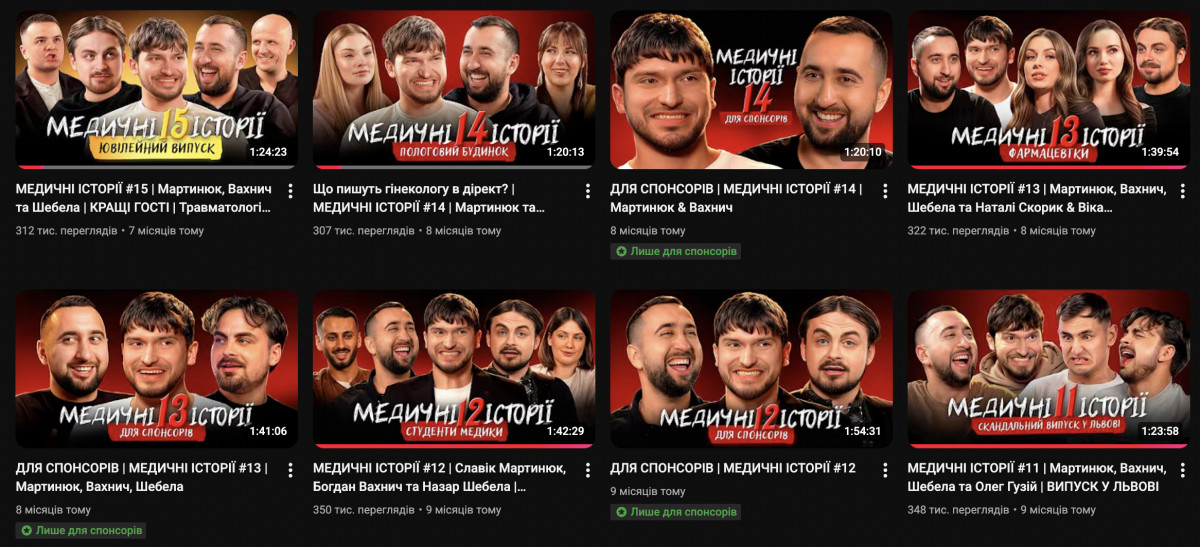 Окремо зі львівського кластера стендаперів хочеться виділити лікарів. Троє коміків із медичним бекграундом (а подекуди навіть не бекграуном, а сьогоденням) за рік випустили 20 відео, в яких вони розповідали байки про медиків і пацієнтів. Богдан Вахнич (протягом існування «Медичних історій» працював лікарем швидкої у Львові), Славік Мартинюк (до ери стендапу в своїй біографії працював у психіатричній лікарні) та Назар Шебело (чинний лікар ортопед-травматолог) протягом року збирали в середньому 350 тисяч переглядів на кожен випуск проєкту. На відміну від тих продуктів, які ми тут описували раніше, що виходять на каналах стендап-клубів, «Медичні історії» одразу виходили на окремому іменному каналі Славіка Мартинюка. З часом, коли Богдан Вахнич теж нарешті завів собі особистий канал, випуски стали виходити у співавторстві.