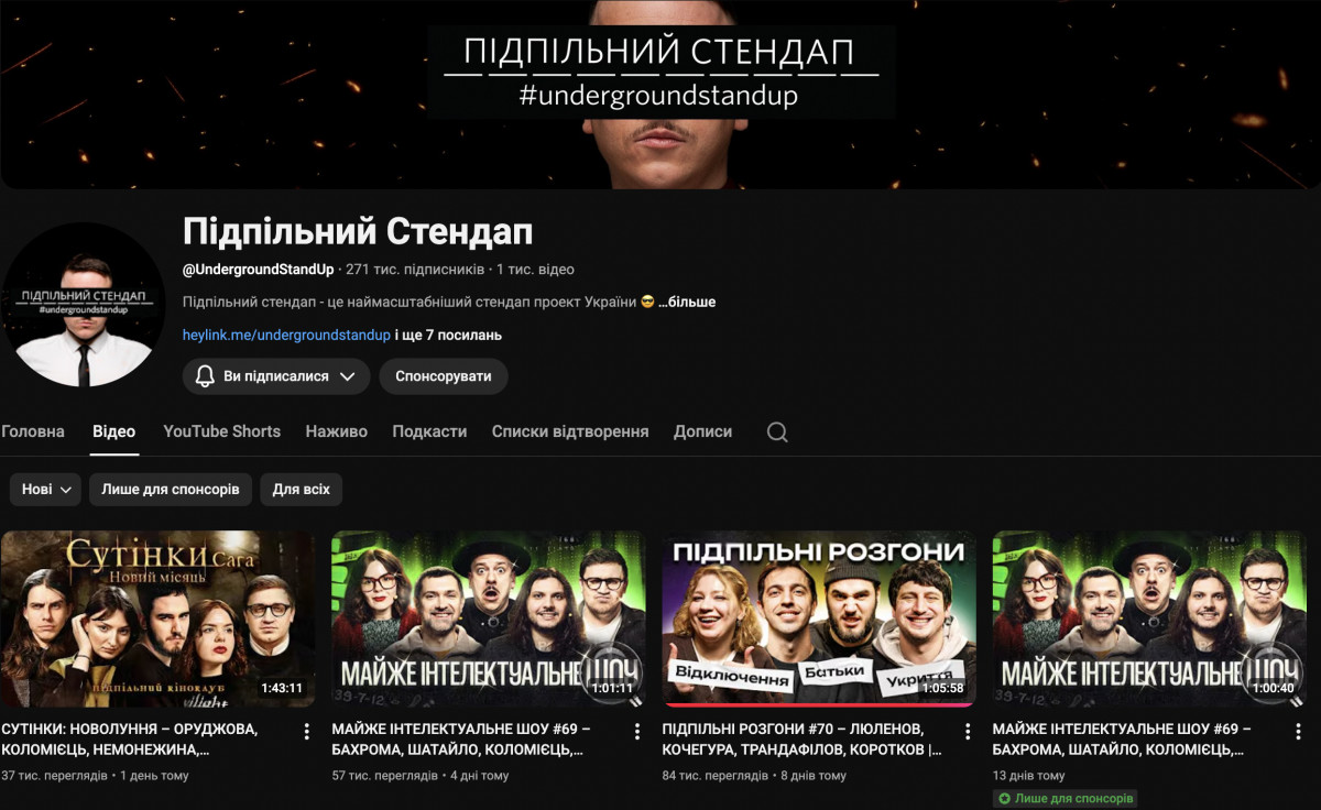 Почнемо з найбільшого кластера — «Підпільний стендап» із 272 тисячами підписників на основному каналі та ще майже 47 тисячами на додатковому «Підпільний.2». Цей другий канал — такий собі «хутір», куди підпільники зазвичай зливають проєкти, які набирають мало переглядів, плюс туди ж ідуть подкасти від учасників клубу. Якщо проєкт починають дивитися краще, він «переїжджає» на основний канал. Так, наприклад, сталося з оновленими «Розгонами», які в цьому сезоні перезапустилися в іншому форматі. Перші декілька випусків я дивилася на «Підпільний.2». Коли вони почали місцями дотягувати до ста тисяч переглядів, то опинилися на каналі «Підпільний стендап». Поки що «у вигнанні» залишаються «Королі кринжу» та «Хвилина уваги». Перший, на мою скромну думку, не має жодних шансів звідти вибратись, адже тонких цінителей гумору, від якого перекошує обличчя, серед шанувальників «Підпільного» не так уже й багато. Другий, за великим рахунком, і не претендує бути флагманським контентом для клубу. «Хвилина уваги» — це такий собі відкритий мікрофон, де вже популярні коміки слухають і оцінюють хвилинні виступи тих, хто тільки мріє про визнання в жанрі.