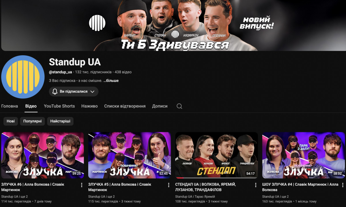 Ще один канал із понад 125 тисяч підписників — «Standup UA». Якийсь час ним опікувався стендапер Тарас Яремій, але згодом він виставив його на продаж. Хто би зараз не вів канал, свої 100 тисяч + переглядів їхні відео отримують стабільно.