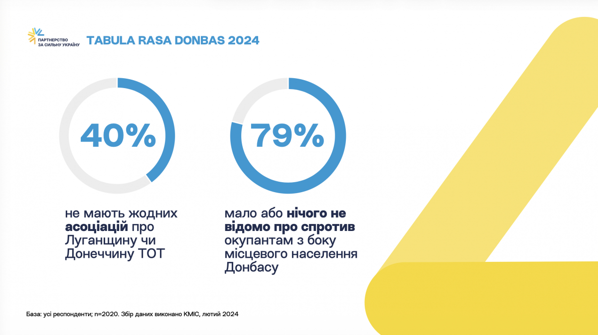 За інформацією з дослідження Київського міжнародного інституту соціології, на запитання про асоціації з Донеччиною і Луганщиною 40% респондентів не мають жодних, а 80% мало або нічого не чули про спротив окупантам з боку місцевого населення.