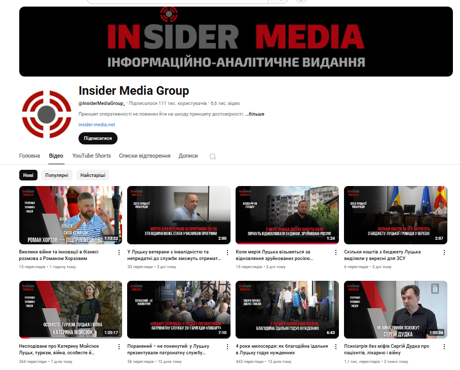 На канал Insider Media, створений 22 березня 2021 року, нині підписані 111 тисяч користувачів, опубліковано 6,6 тисячі відео.