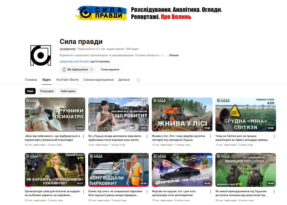 На момент написання матеріалу на ютуб-каналі “Сили правди” 13,7 тисячі підписників і 364 відео.